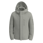 Gray hooded sports jacket made of coarse-knit snowflake fleece, with very distinctive fabric. It features a hood, a zipper placket, and is lined with cotton for windproofing and warmth.