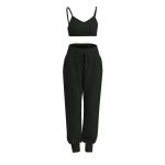 Black suspender yoga two-piece set, made of high stretch spandex double-sided fabric, soft, breathable and comfortable. Above is in the form of a short camisole, paired with tapered sports pants for a casual and fashionable look.